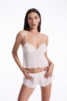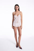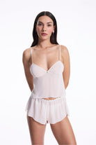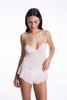A subtle touch to your nightwear. The Love Set, crafted from fully sheer chiffon, moves in harmony with your body thanks to its delicate strappy top and mini shorts reminiscent of a skirt silhouette.