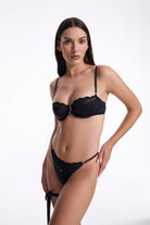 Featuring delicate lace craftsmanship at the waistband and a soft satin touch at the front center, the Monica Thong guarantees a perfect fit with adjustable side elastics. It pairs seamlessly with the Monica Bra and Monica Leg Accessory for a flawless ensemble.