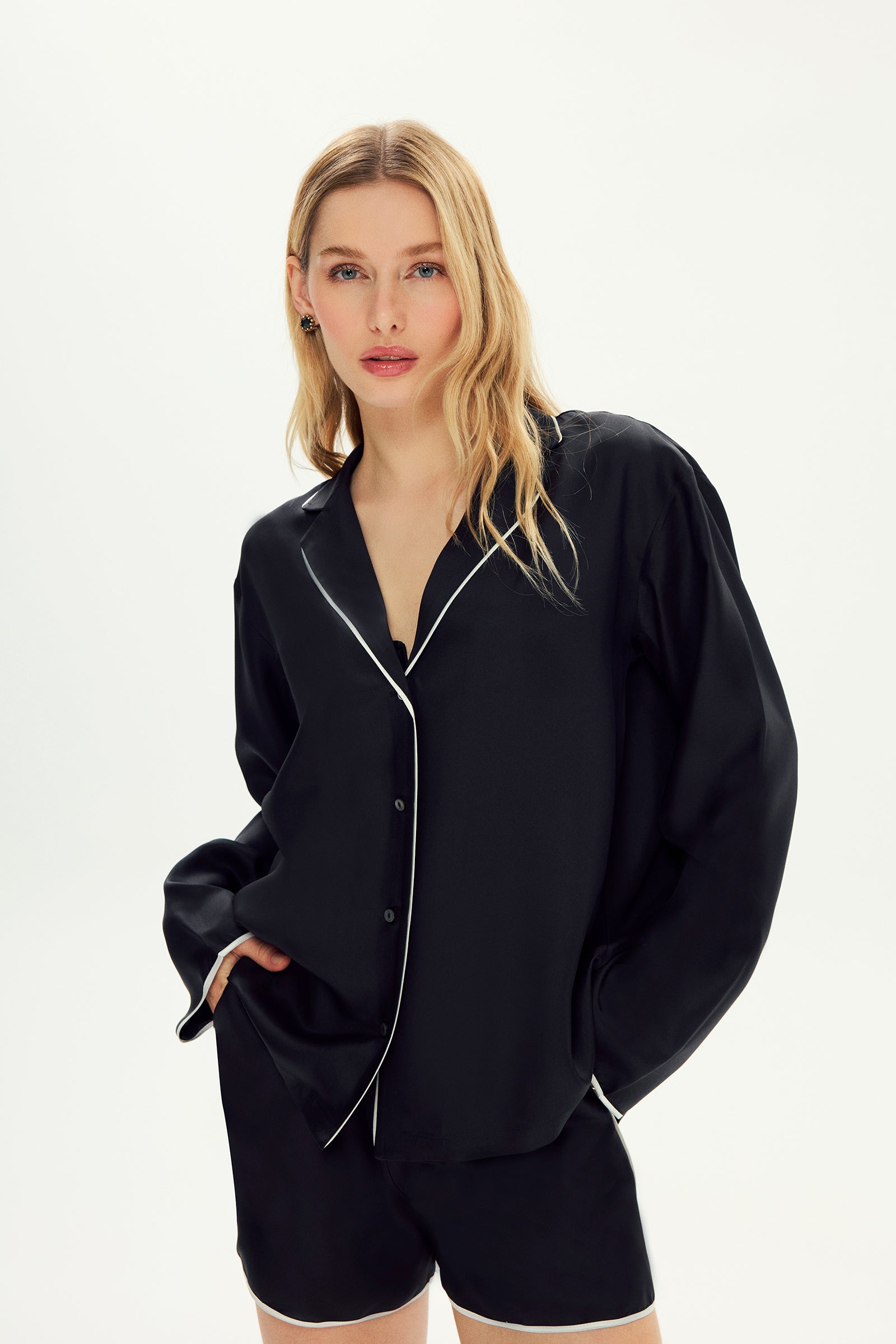 Silk Twill Adira Bias Shorts Pyjama Set is a stylish option that you can choose comfortably both at home and outdoors with its oversized cut. It will be indispensable for your daily style with its effortless elegance and soft silk texture. The elegant bias detailing allows you to wear this cosy set without compromising your elegance.