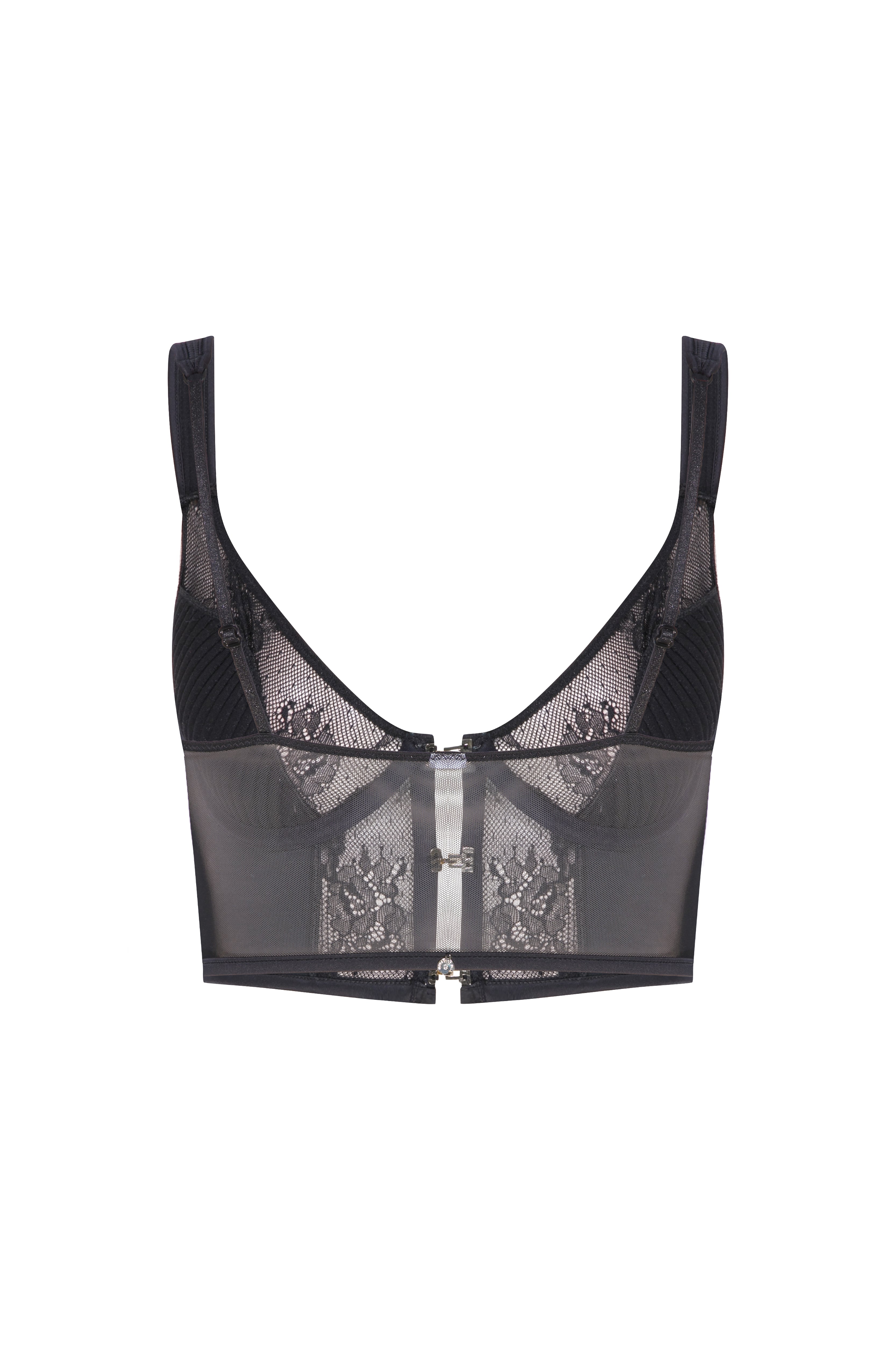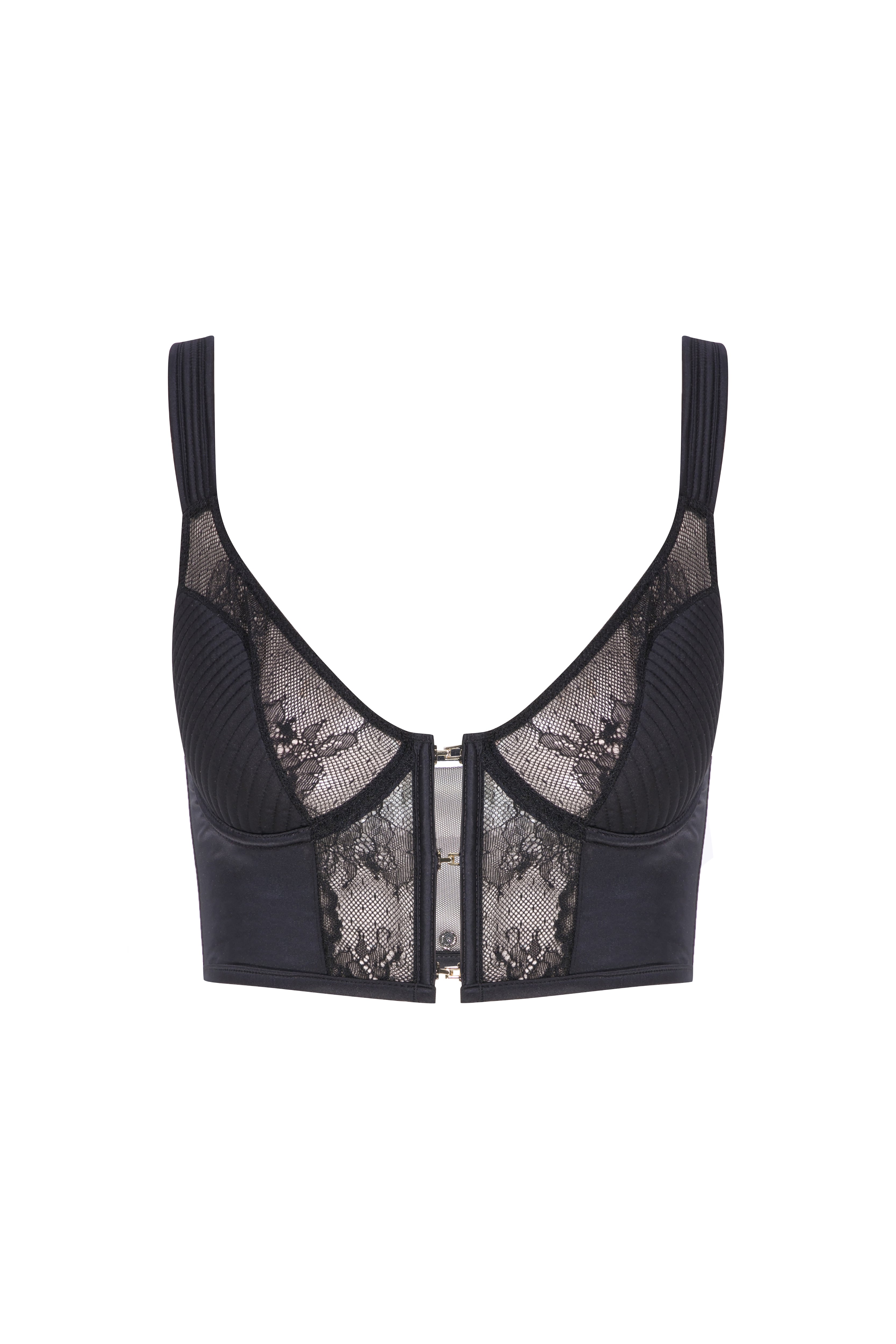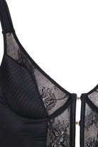 Estelle Lace Satin Bustier perfectly hugs your curves with ribbed details on the side and elegant luxury lace, creating a strong and sophisticated look. Pair it with jeans for a chic and bold style. A perfect choice for both everyday life and special occasions.