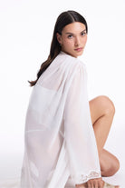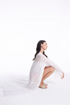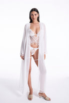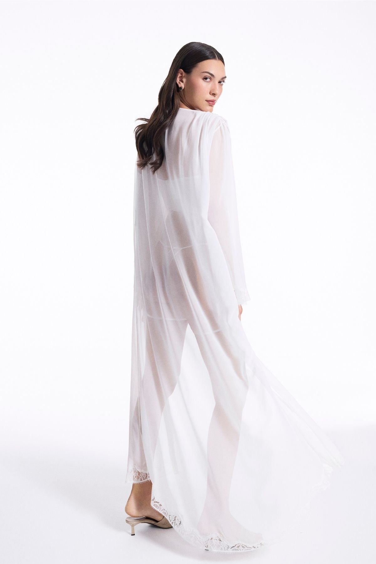 The flowing chiffon fabric, long length, and lace details on the sleeves and hem add an elegant movement to every step you take.
