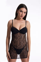 With its underwired construction, it gently hugs the body, offering elegant support. The patterned lace extending from the bust to the hem, combined with sheer side panels, creates a striking look. Adjustable straps provide a personalized fit. With its captivating and timeless silhouette, it leaves a lasting impression at every glance.