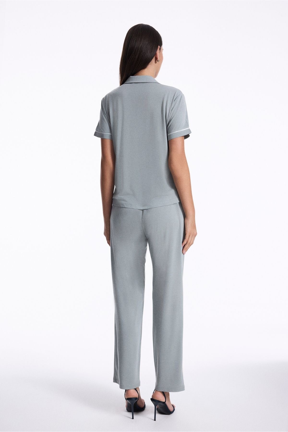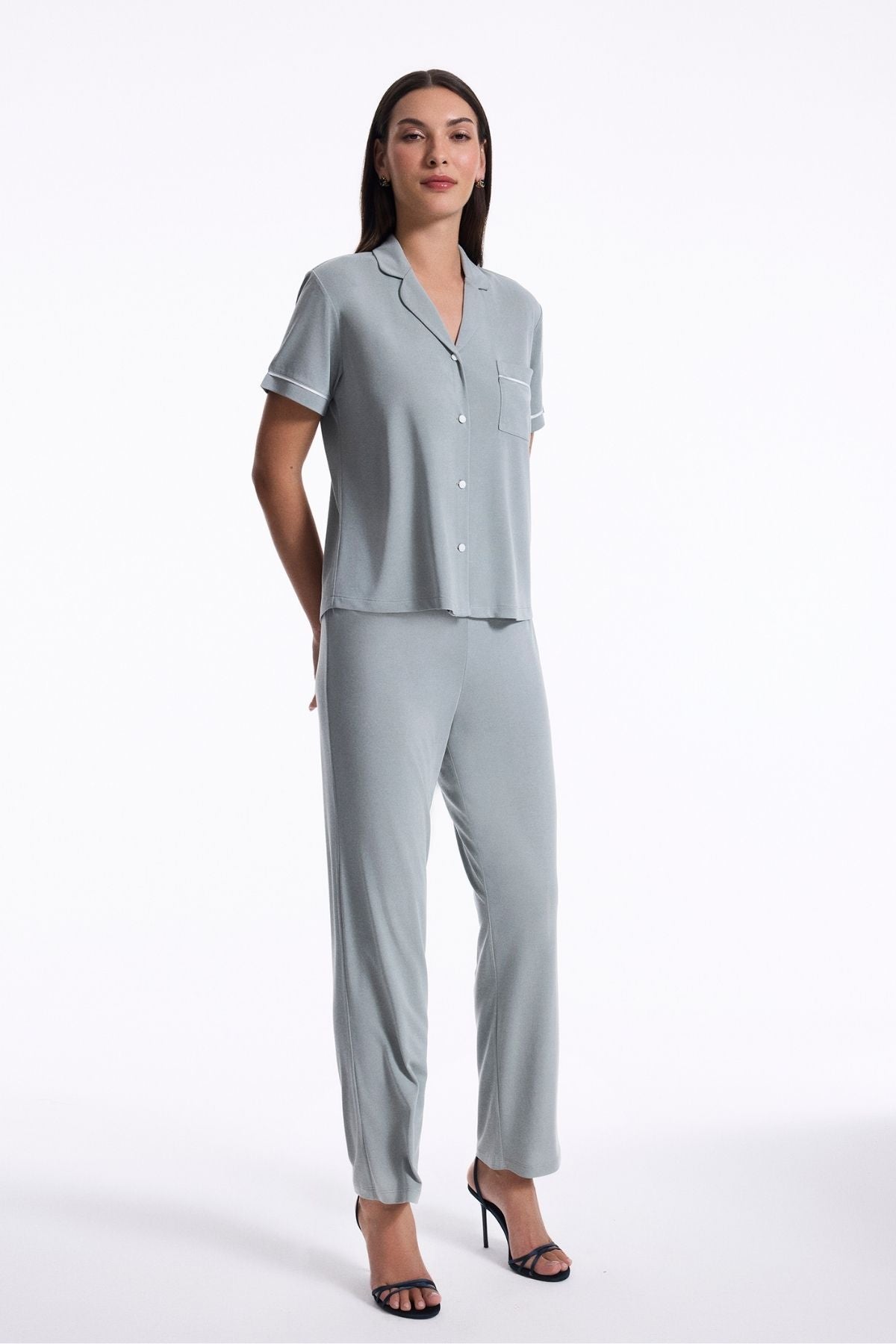 Crafted from ultra-soft fabric, this pajama set includes a half-sleeve shirt with contrast piping and fabric-covered buttons, paired with elastic-waist pants for a comfortable yet polished look.