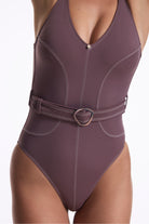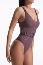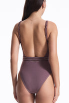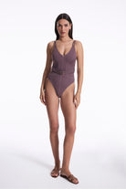 Lana Swimsuit, in a soft plum hue, the Lana Swimsuit is the most romantic design in our Swimwear collection. Its signature knotted straps and bronze belt add a sophisticated and unique touch. Whether you're styling it for the beach or the city, this piece is ready to accompany you effortlessly throughout the day.