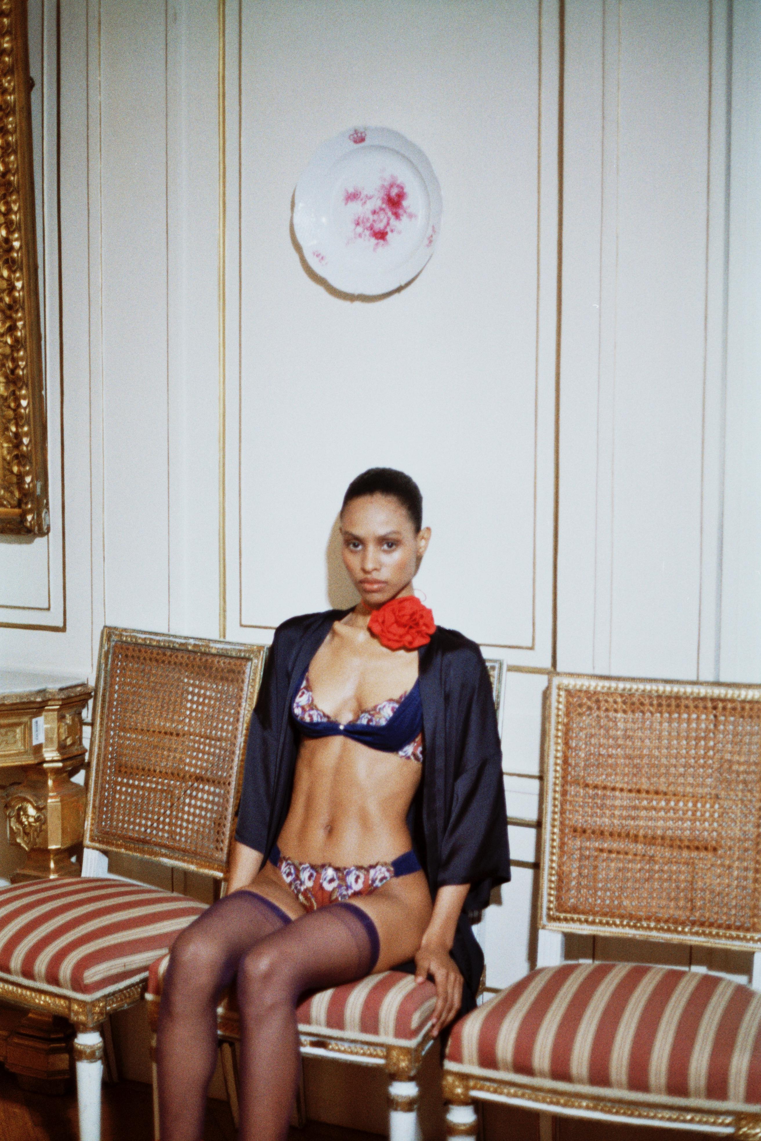 The model wears a size 75B / Small.