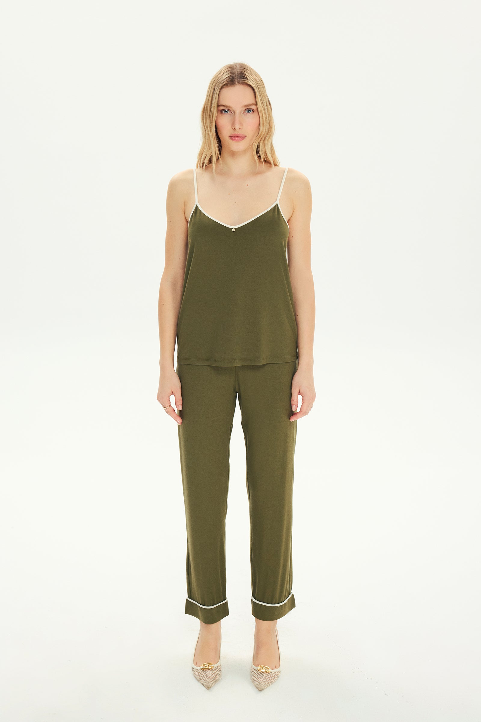 Levia is here with the softest touch of the collection. It offers a sophisticated elegance with the mesmerising shade of green and carefully designed piping details. This design, which meets the softest textures, creates a second skin feeling on the skin.