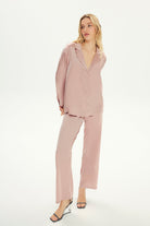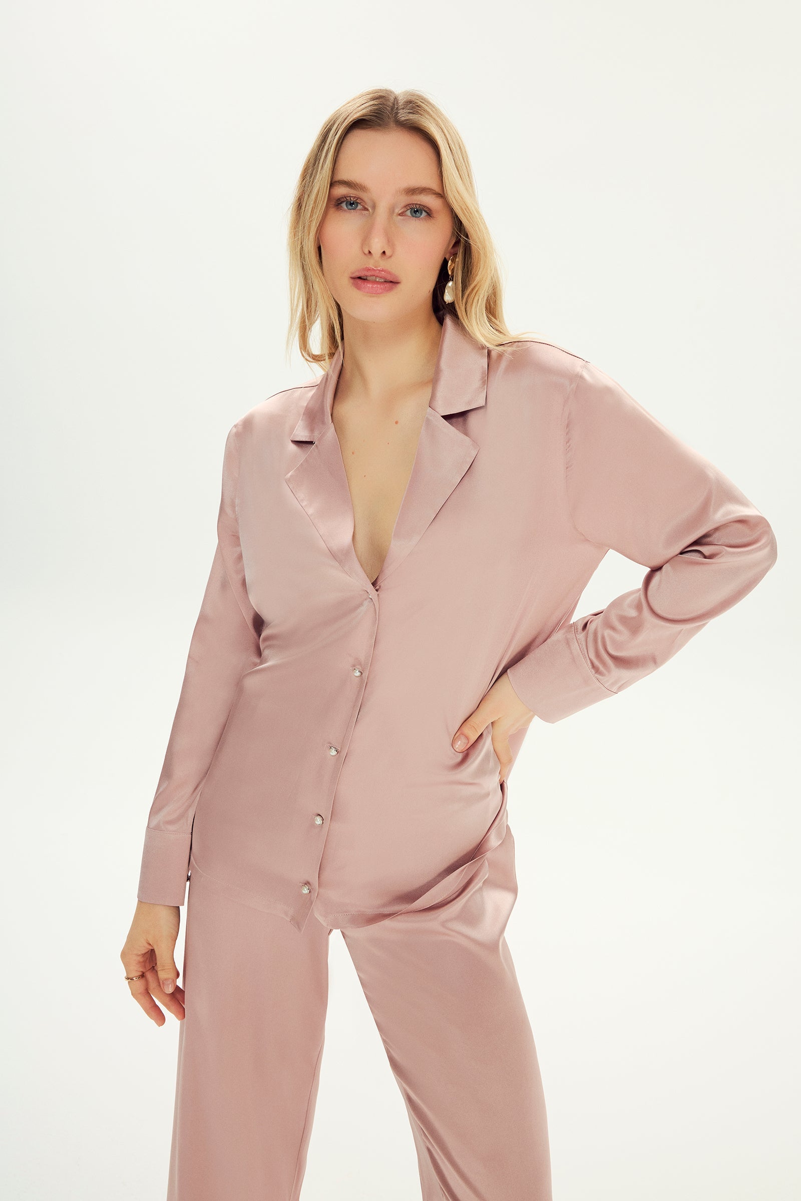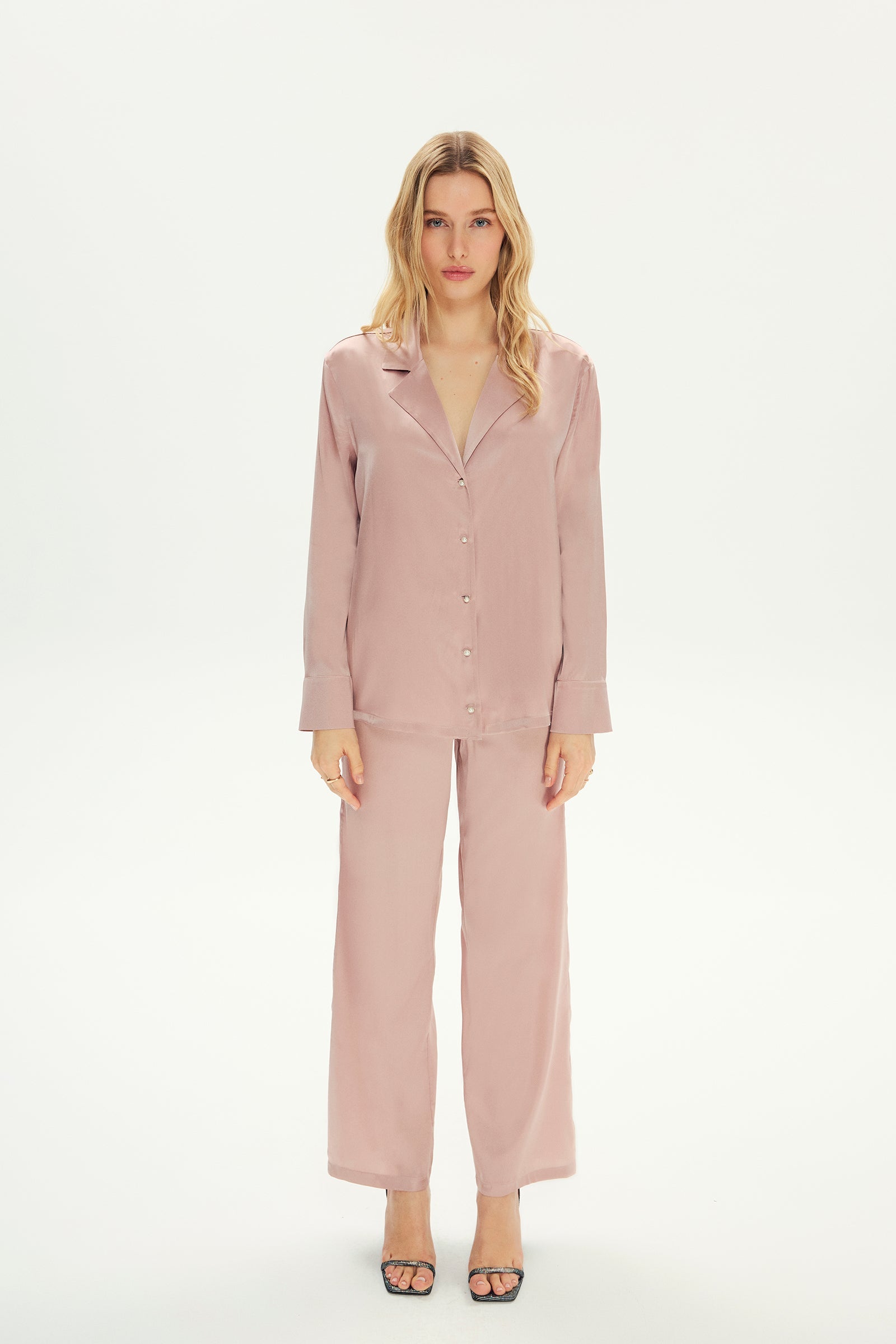 Silk Juliette Pyjama Set Soft Pink has an elegant and sophisticated design with pearl button details. It offers both comfort and elegance with its soft silk fabric and stylish lines. You can create a perfect look that can be carried to the night by combining it with heels.