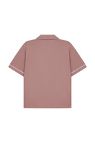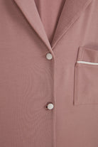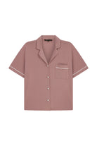 Crafted from ultra-soft fabric, this pajama set includes a half-sleeve shirt with contrast piping and fabric-covered buttons, paired with elastic-waist pants for a comfortable yet polished look.